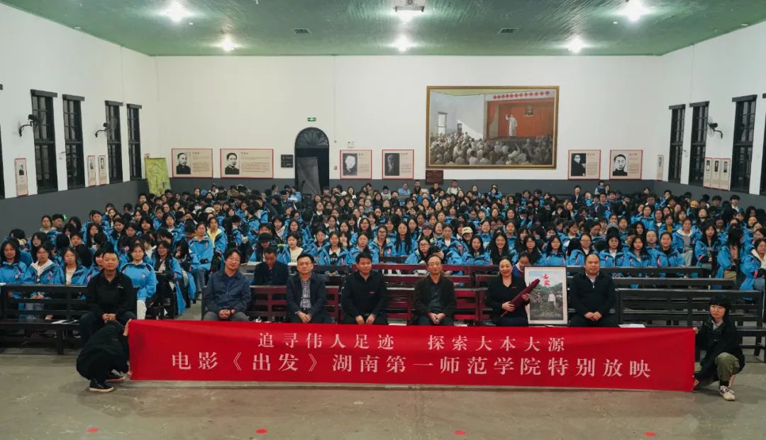 湖南第一師范學(xué)院素有“千年學(xué)府,百年師范”的美譽,不僅是毛澤東思想的萌芽地,也是中國共產(chǎn)主義運動和新民主主義革命的重要策源地。3月18日下午,習(xí)近平總書記在考察湖南第一師范時囑托:“國家要強大,必須辦好教育。一師是開展愛國主義教育、傳承紅色基因的好地方,要把這一紅色資源保護運用好。學(xué)校要立德樹人,教師要當好大先生,不僅要注重提高學(xué)生知識文化素養(yǎng),更要上好思政課,教育引導(dǎo)學(xué)生明德知恥,樹牢社會主義核心價值觀,立報國強國大志向,努力成為堪當強國建設(shè)、民族復(fù)興大任的棟梁之材。”近年來,學(xué)院充分利用其深厚的紅色文化底蘊,為電影《出發(fā)》的拍攝工作提供全方位的支持與協(xié)助。本次特別放映活動,旨在牢記囑托,堅守立德樹人的根本使命,通過生動的“電影思政課”形式,傳承并弘揚紅色傳統(tǒng),培育深厚的家國情懷,為青年學(xué)子們搭建了一個深入了解國家歷史、學(xué)習(xí)先輩們寶貴精神的有效平臺。