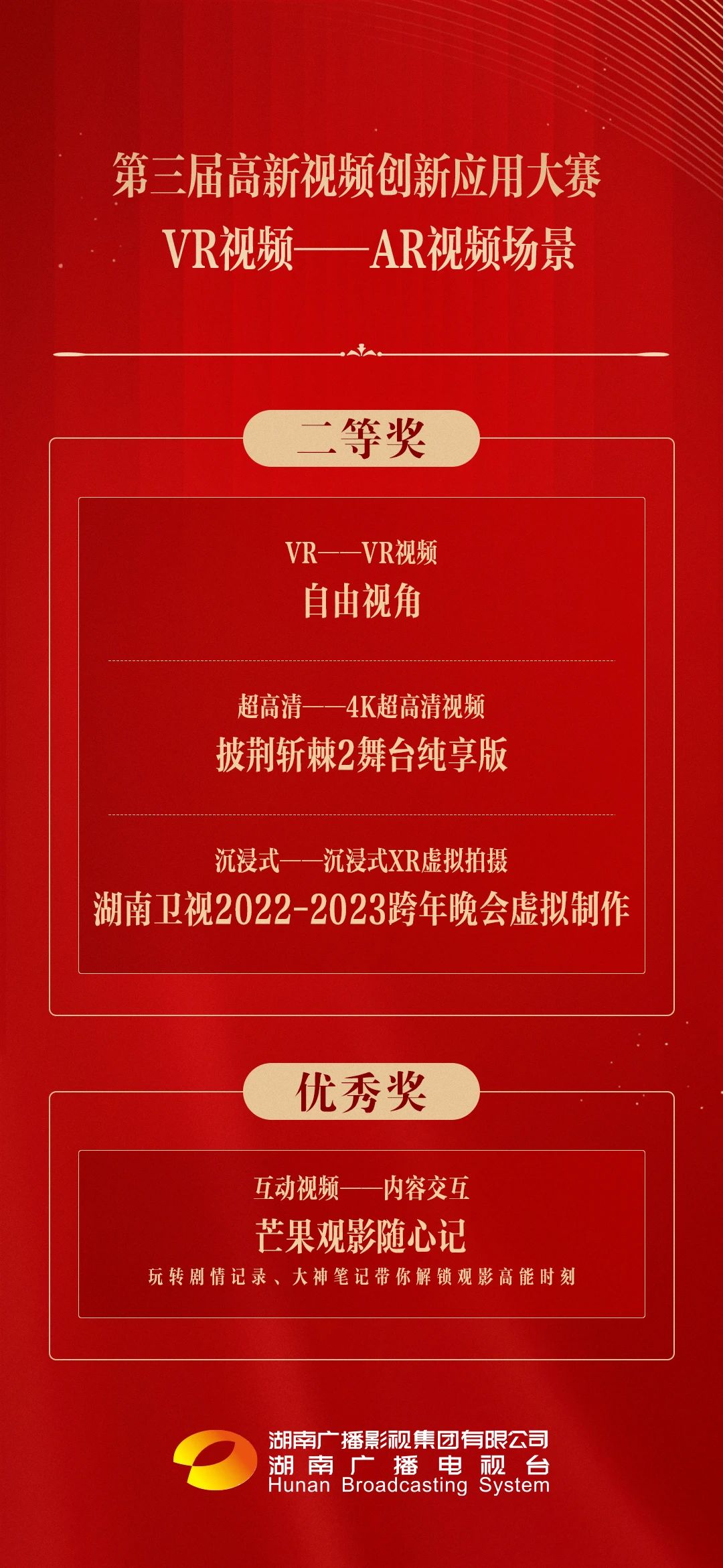 湖南廣播影視集團(tuán)報送的4K超高清視頻“披荊斬棘2舞臺純享版”以及使用沉浸式XR虛擬拍攝的“湖南衛(wèi)視2022-2023跨年晚會虛擬制作”兩個項目和芒果TV報送的“自由視角的VR視頻”與“互動視頻——內(nèi)容交互芒果觀影隨心記-玩轉(zhuǎn)劇情記錄、大神筆記帶你解鎖觀影高能時刻”2項技術(shù)獲得“第三屆高新視頻創(chuàng)新應(yīng)用大賽 VR視頻——AR視頻場景”榮譽(yù)。