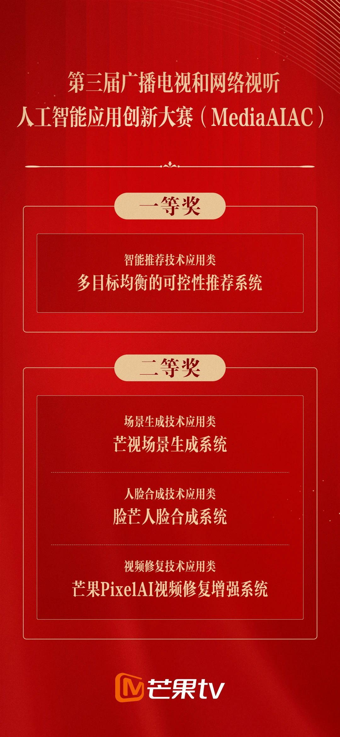 湖南廣電共獲得8項榮譽(yù),涵蓋一二三等獎及優(yōu)秀獎。其中,芒果TV報送的“多目標(biāo)均衡的可控性推薦系統(tǒng)”“芒視場景生成系統(tǒng)”“臉芒人臉合成系統(tǒng)”與“芒果PixelAI視頻修復(fù)增強(qiáng)系統(tǒng)”4項技術(shù)獲得“第三屆廣播電視和網(wǎng)絡(luò)視聽人工智能應(yīng)用創(chuàng)新大賽”榮譽(yù)。