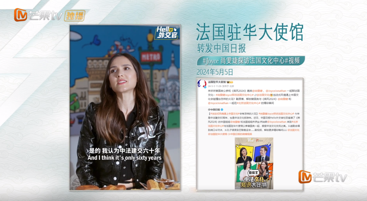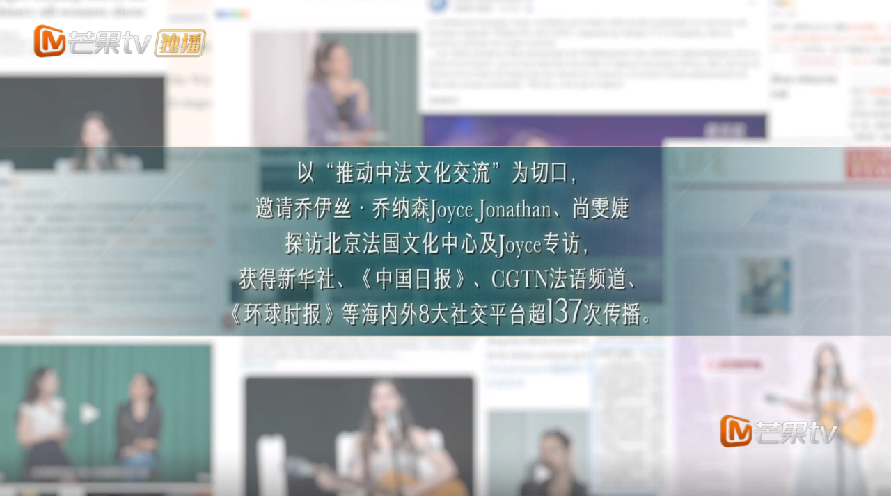 自參加節(jié)目以來,喬伊絲以真誠的演唱和驚人的實(shí)力收獲了全球觀眾的無數(shù)好評。同時,借在中國錄制節(jié)目的機(jī)會,喬伊絲也在各種文化活動中更深入地傳遞中法文化交流魅力。正值中法建交60周年,喬伊絲與尚雯婕在法國駐華大使館公參裴國良的介紹下,探訪北京法國文化中心,了解巴黎奧運(yùn)會的籌備情況,合唱中國傳統(tǒng)戲曲越劇,分享自己喜愛的儒家名言。在新華社、CGTN法語頻道、環(huán)球時報等媒體的采訪中,喬伊絲也積極分享自己在中國的所見所感,并感慨:“節(jié)目中姐姐們和中國人的開放包容,讓我有了一種中國是家的感覺。”喬伊絲深度感受中法文化交流的經(jīng)歷,也獲中國駐法國大使館推特、法國駐華大使館、法國文化、中國日報、CGTN法語頻道、環(huán)球時報海內(nèi)外8大社交平臺超137次傳播,向全世界的觀眾傳遞中法文化交流碰撞產(chǎn)生的無限魅力。