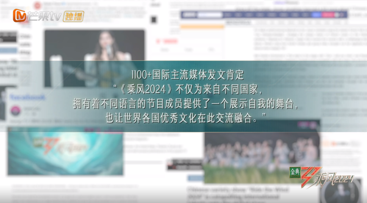 作為一檔國際女性文化交流與音樂競演節(jié)目,《乘風(fēng)2024》堅持“傳播文化自信”與“加深國際交流”兩大核心,邀請來自包括美、俄、法、越、泰等國家在內(nèi)全球各地的優(yōu)秀女性代表,在極具東方韻味的全新舞臺上,共同感受中華經(jīng)典美學(xué)魅力,交流世界優(yōu)秀文化風(fēng)采,開啟東方舞臺文化出海新篇。自播出以來,《乘風(fēng)2024》收獲了無數(shù)觀眾關(guān)注和喜愛,近萬次登陸全網(wǎng)各大社交平臺熱搜,超500次登頂各大綜藝排行榜。新華社、人民日報、中國日報、美聯(lián)社、CNN(美國有線電視新聞網(wǎng))、Financial Times(金融時報)等國內(nèi)外主流媒體超1200次發(fā)文肯定節(jié)目“讓世界各國優(yōu)秀文化在此交流融合”、“以音樂搭建文化交流橋梁”。