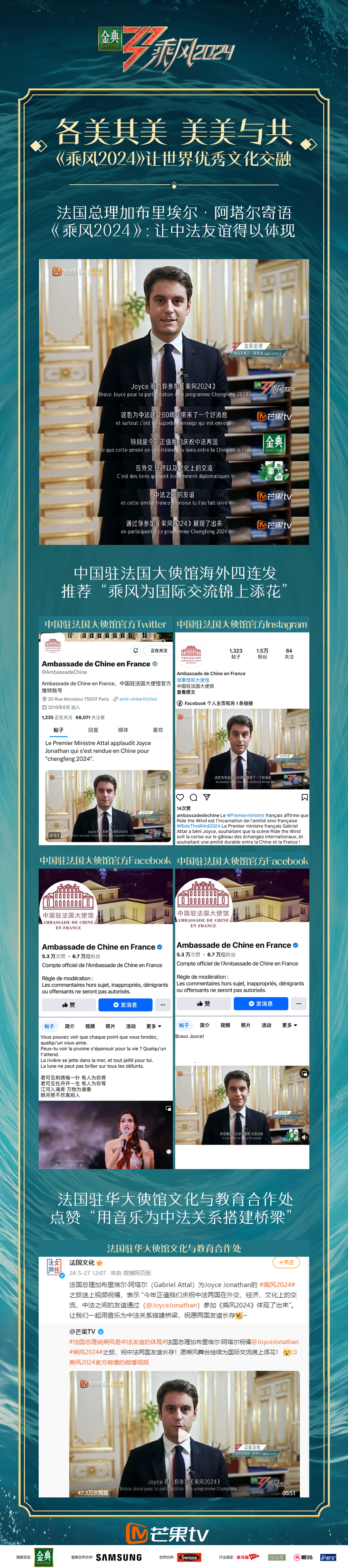 中國駐法國使館在推特、Facebook及ins上四次推薦“法國總理寄語《乘風(fēng)2024》”及喬伊絲舞臺表現(xiàn),認(rèn)為“乘風(fēng)為國際交流錦上添花”,法國駐華大使館文化與教育合作處官方微博@法國文化 也評論“用音樂為中法關(guān)系搭建橋梁”,并祝愿“中法友誼長存”。中國及海內(nèi)外觀眾紛紛點(diǎn)贊:“《乘風(fēng)2024》推動中國的傳統(tǒng)文化走向了世界”。