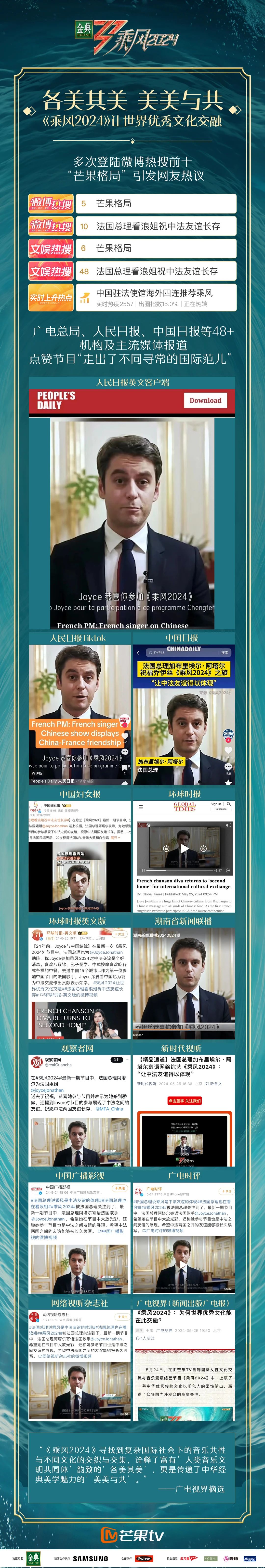 同時,人民日報英文客戶端、人民日報Tiktok報道“法國總理阿塔爾稱法國歌手登《乘風(fēng)2024》代表著中法友誼”,廣電總局、環(huán)球時報、中國日報等48家主流媒體,觀察者網(wǎng)推特等海外渠道也發(fā)布相關(guān)內(nèi)容,話題#法國總理看浪姐祝中法友誼長存#登陸微博熱搜榜TOP10,網(wǎng)友熱議“原來法國總理也在看《乘風(fēng)2024》”、“這波格局大了”,#芒果格局# 隨后登陸微博熱搜榜TOP5,網(wǎng)友點(diǎn)贊“芒果格局已經(jīng)next level了”。