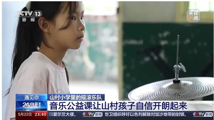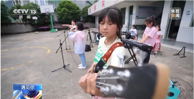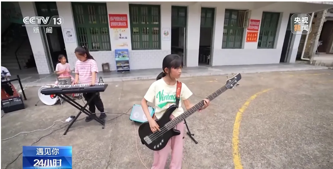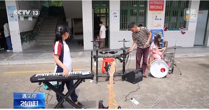 五月時節(jié),陽光照進群山環(huán)抱的湖南衡陽縣岣嶁鄉(xiāng)妙溪小學,音樂教室里傳來歡快的樂曲演奏聲。幾個孩子正在練習貝斯、電子琴和架子鼓,為他們的演出認真做準備。