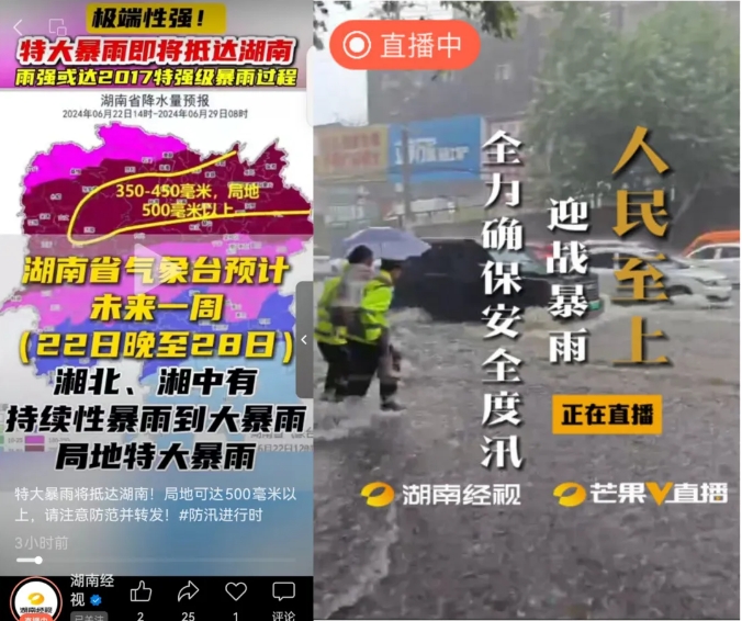 湖南經(jīng)視《經(jīng)視新聞》開設(shè)“防汛進(jìn)行時(shí)”特別板塊,記者深入本輪降雨最為集中的醴陵市、綏寧縣等地,播出多條生動(dòng)感人的新聞特寫。湖南經(jīng)視視頻號(hào)、經(jīng)視大調(diào)查抖音號(hào)、芒果V直播抖音號(hào)開啟現(xiàn)場直播,8路記者現(xiàn)場直擊各地迎擊暴雨和救援搶險(xiǎn)。同時(shí)發(fā)動(dòng)全省各地通聯(lián),及時(shí)發(fā)布第一手防汛應(yīng)急信息和全省各地干部群眾、公安消防等奮斗在一線的抗洪搶險(xiǎn)短視頻。其中,《長沙大暴雨中的那抹“熒光綠” 向他們致敬》記錄了長沙暴雨中交警不畏艱險(xiǎn)沖在一線,背負(fù)老人在雨中穿梭,腳踩齊腰深的洪水指揮被困車輛的事跡。截至6月24日13時(shí),已發(fā)布短視頻35條。